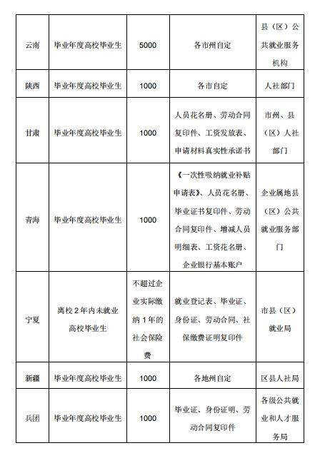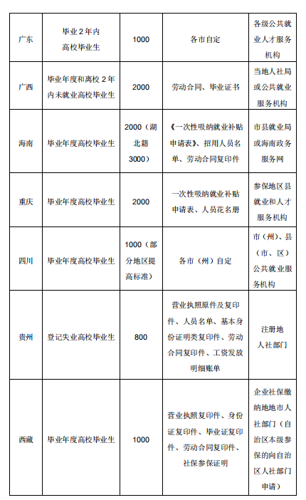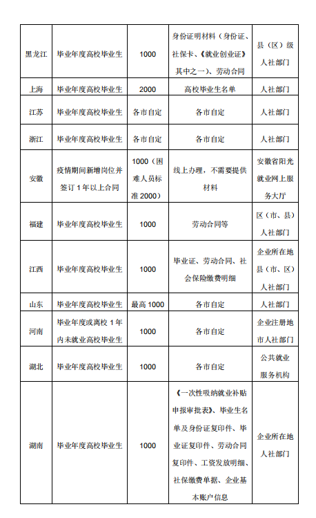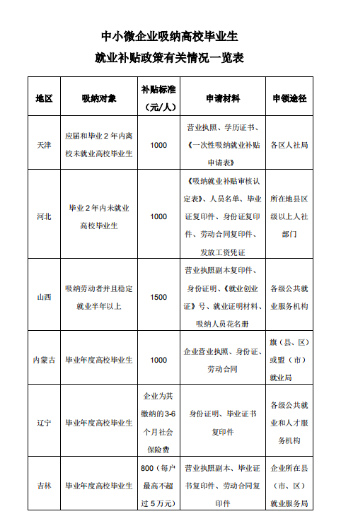 人民网北京7月23日电 (孟植良)中小微企业是吸纳就业的主渠道,也是很多高校毕业生踏上职场、挥洒才智的阵地。记者从人社部了解到,今年为鼓励中小微企业吸纳高校毕业生就业,国务院办公厅《关于应对新冠肺炎疫情影响强化稳就业举措的实施意见》提出,对中小微企业招用毕业年度高校毕业生并签订1年以上劳动合同的,给予一次性吸纳就业补贴。 为便于符合条件的中小微企业申领享受补贴政策,我们专门梳理了各地补贴发放标准和申领途径。目前,此项补贴正在审核发放过程中。具体申请材料和申领流程请咨询当地人力资源社会保障部门。