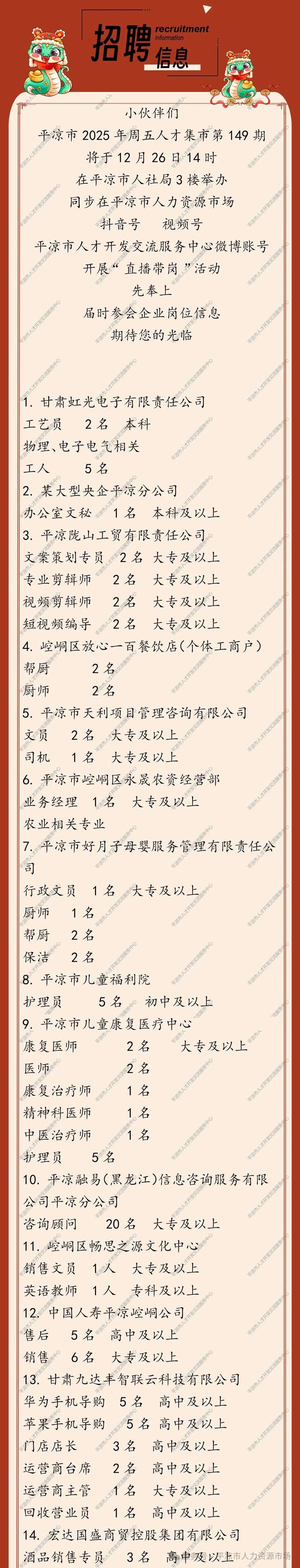 发布时间:2025-12-24 来源:平凉市人力资源市场 作者:佚名 网络编辑:平凉市人力资源市场 浏览次数:196 次