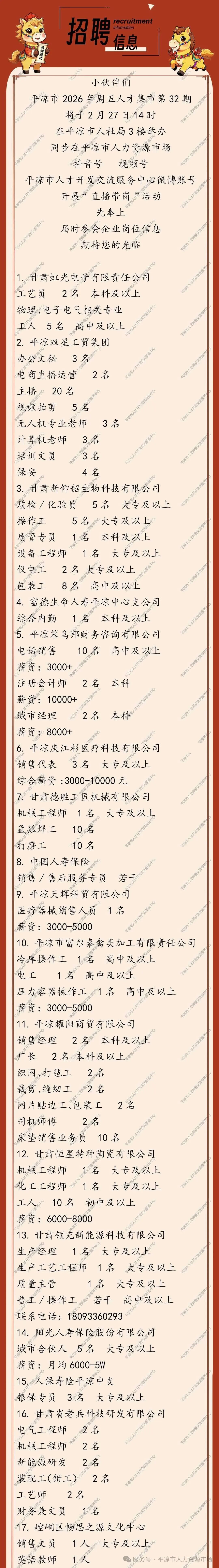 | 发布时间:2026-02-25 来源:平凉市人力资源市场 作者:佚名 网络编辑:平凉市人力资源市场 浏览次数:5 次 | |