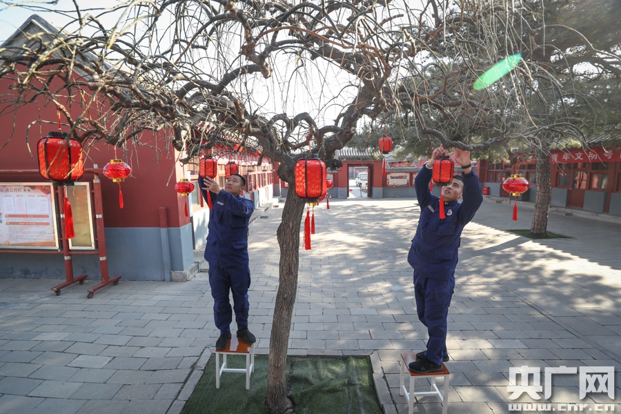 跟往年一样,消防员们都留守故宫。对他们来说,就地过年早已是常态。张肖在过去的7个春节中,只回过一次山东老家,“早就习惯了”。今年过年,执行完任务后,消防队将组织一些文体活动,为消防员发放节日礼品,增加些节日氛围。 消防队员们正在挂灯笼(央广网记者 韩靖 摄) 在这里,工作与生活是交融的,一切都是为了确保故宫安全无虞。“我们不能打破故宫50年的零火灾纪录,也不能辜负多年积攒下来的荣誉,所以,压力大,荣誉感也多。”张肖说。