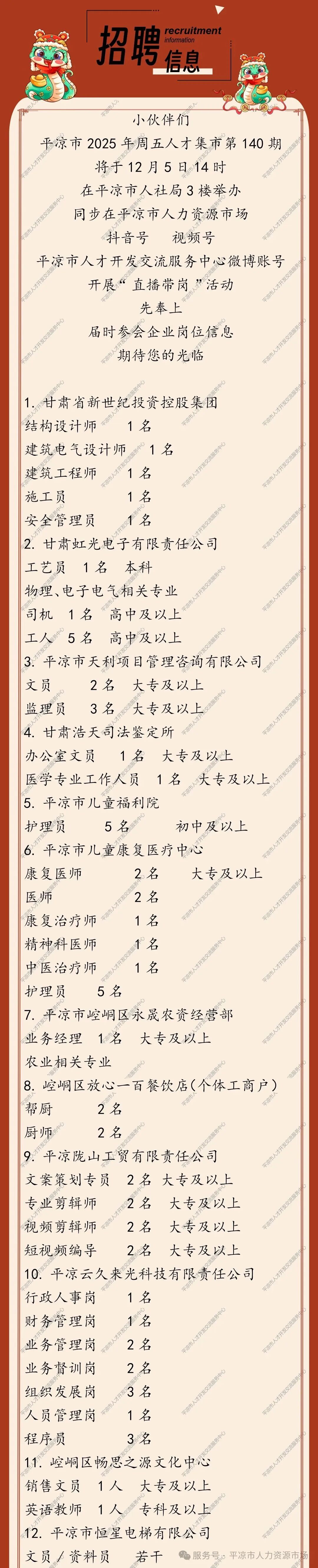 发布时间:2025-12-04 来源:平凉市人力资源市场 作者:佚名 网络编辑:平凉市人力资源市场 浏览次数:64 次