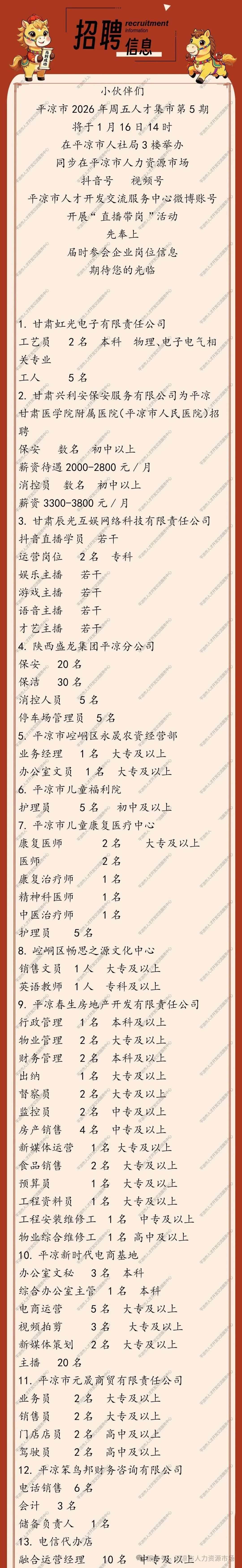 发布时间:2026-01-15 来源:平凉市人力资源市场 作者:佚名 网络编辑:平凉市人力资源市场 浏览次数:84 次