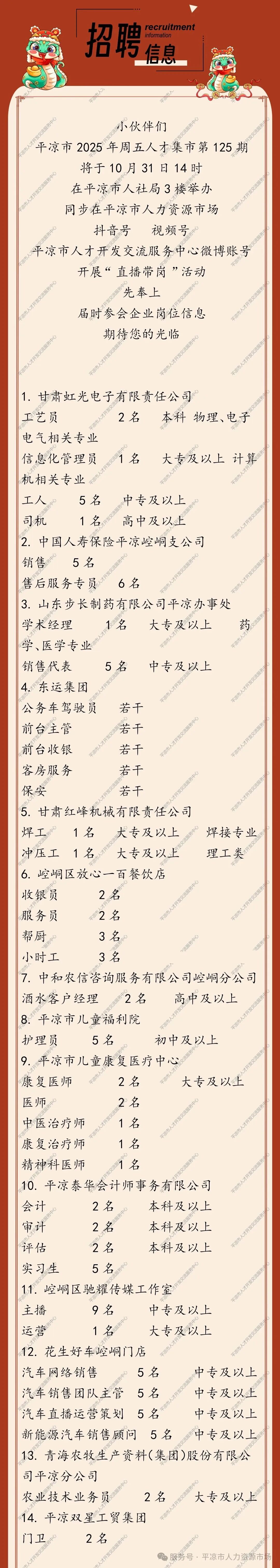发布时间:2025-10-29 来源:平凉市人力资源市场 作者:佚名 网络编辑:平凉市人力资源市场 浏览次数:311 次