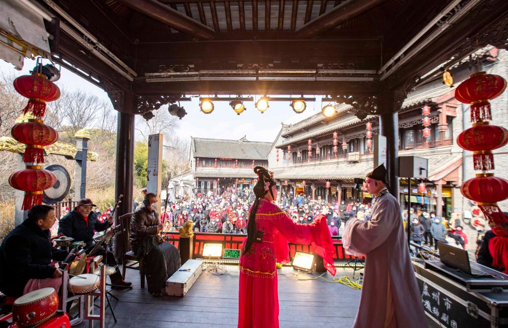 1月24日,江苏省泰州市海陵区小鹰扬剧团在泰州老街古戏台表演扬剧《珍珠塔·赠塔》选段。新华社发(汤德宏 摄)