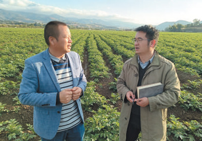 云南分社记者徐元锋(右)在云天化肥料用户临沧市沙河乡忙孝马铃薯合作社采访。
