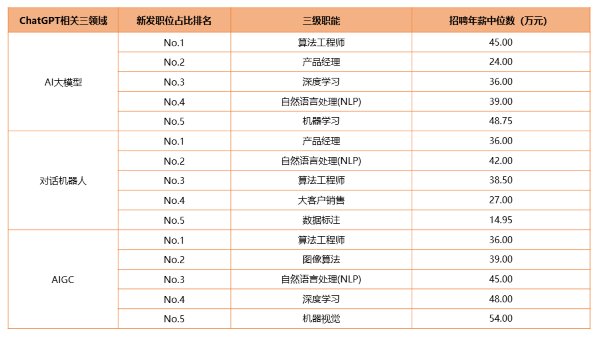2023年一季度三领域新发职位占比排名与招聘薪资。数据来源:猎聘大数据 在求职方面,AI等数字技术行业优渥的薪资水平和职业空间正在吸引着更多求职者的青睐。 拉勾招聘数据显示,智能制造/智能硬件、人工智能等行业成为数字科技人才的首选赛道,分别有25%的受访人希望进入相关行业。 智联招聘数据显示,一季度,2023届毕业生投递数字经济相关行业简历数量同比增幅达155.3%。 猎聘数据显示,一季度AIGC人才同比增长超20%,对话机器人人才增长7.9%。 与此同时,企业仍然缺乏数字化专业人才。3月17日,社会科学文献出版社等发布的《产业数字人才研究与发展报告(2023)》指出,当前我国数字人才缺口为2500万至3000万。智联招聘与北大国发院联合调查显示,2022年超八成企业开启数字化转型,41.2%的企业缺乏具有数字化专业背景的人才。 业内人士认为,随着各行业加速数字化转型与智能化升级,数字化人才需求会持续增加。 “目前每个行业的企业在自动化、数字化和智能化上水平都在不断提升,迫切需求相应的技术人才。AI人才也是如此,相关需求还会保持快速增长,特别是高层级岗位更加明显。”智联招聘执行副总裁李强对记者表示,预计会有更多企业为抢占产业高地而高薪聘请“塔尖人才”,未来人才结构将向高知化、复合化、年轻化方向发展。 “大语言模型的出现让科技从业者相信,AI的类人推理计算能力正在走向实用。”在电子科技大学网络空间安全学院院长张小松来看,技术的进步在短期内看似在跟人类现有职业竞争,但是随着时间的拉长和适应,技术更多的是促进社会的发展进步,催生更多就业机会,“比如,Prompt工程师就是一个新的职业。” 张小松同时指出,人类的创新能力是AI无法完全模拟的,将AI为己所用,将为科技人才打开更大发展空间。 注1:仅统计企业名称、经营范围、产品名称包含关键词“人工智能”“AI”的企业 |