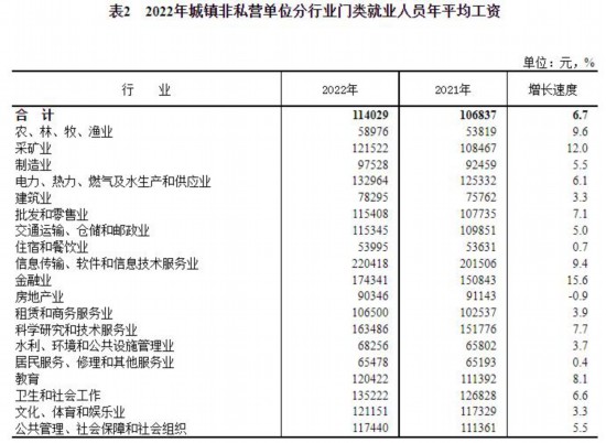 2022年城镇非私营单位分行业门类就业人员年平均工资。来自国家统计局网站 国家统计局数据显示,城镇非私营单位中,IT业年平均工资达到220418元。城镇私营单位中,IT业年平均工资达到123894元。 在一些省份,IT业平均工资同样高居榜首。以浙江为例,浙江省非私营单位中,信息传输、软件和信息技术服务业年平均工资突破28万元,达到了287088元,远超其他行业。 再比如重庆,城镇非私营单位19个行业门类中,信息传输、软件和信息技术服务业平均工资最高,超过16万元,达到166375元,是全市平均水平的1.55倍。 为什么IT业平均工资傲视群雄?近年来,随着数字经济和信息化发展,信息传输、软件和信息技术服务业工资水平与增速一直维持在较高水平。国家统计局数据显示,受人们对互联网学习、工作、社交和网络购物需求量较大等因素影响,2022年信息传输、软件和信息技术服务业两类单位平均工资分别增长9.4%和8.1%。 看增速:金融业平均工资涨幅最高 从全国数据来看,不管是城镇非私营单位还是私营单位,金融业平均工资水平仅次于IT业,排在第二位。 而从平均工资增速来看,金融业平均工资涨幅最高。国家统计局数据显示,城镇非私营单位和城镇私营单位中,金融业平均工资增速均为15.6%。 从地方来看,一些省份的金融业平均工资增速高居第一。以广西为例,城镇非私营单位中,金融业就业人员年平均工资增长16.6%,高于全国平均水平1.0个百分点,是非私营和私营两种类型单位中唯一实现两位数增长的行业。 广西统计局分析,增长较快的原因主要受行业结构调整、减员增效影响。2022年金融行业中保险代办员群体大量减少,行业低收入群体比例明显下降,金融行业平均工资水平变化较大。 在部分省份,金融业平均工资水平占据第一。以云南为例,城镇非私营单位就业人员年平均工资最高的行业是金融业,达到145501元。