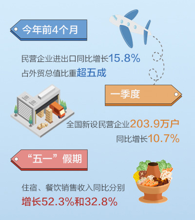数据来源:海关总署、国家市场监督管理总局、国家税务总局 制图:实习生刘文静 今年前4个月,民营企业进出口同比增长15.8%,占外贸总值比重超五成;一季度,全国新设民营企业203.9万户,同比增长10.7%;“五一”假期,住宿、餐饮销售收入同比分别增长52.3%和32.8%……随着中国经济“烟火气”越燃越旺,民营经济的活力越来越足。 民营经济是推动经济增长、实现高质量发展的重要力量。今年以来,随着疫情防控较快平稳转段,民营经济加快复苏,民营企业活力不断释放,为国民经济持续企稳回升注入强劲动能。 “今年第一季度,我们的出口额同比增长16.3%。”5月8日,宜都市清风园茶业有限公司厂区内,工人们正开足马力炒制春茶。公司经理孙永明介绍,从采摘到加工严把质量关,企业赢得了越来越多的海外订单和信赖。 今年以来,我国外贸延续稳中向好势头,民营企业成为外贸主力军。据海关统计,前4个月,民营企业进出口7.05万亿元,同比增长15.8%,占我国外贸总值的52.9%,比去年同期提升4.6个百分点。 不仅是外贸稳住了,内需也涌现出新亮点。在山东淄博,“五一”假期第一天,八大局就涌进12万人次。今年3月以来,这个普通的菜市场,见证了淄博旅游、餐饮等消费服务行业的快速恢复。整个“五一”期间,淄博旅游业消费额环比4月增长73%。有淄博烧烤店老板透露,“五一”假期期间,自己门店的销售额能突破30万元。 放眼全国,在旅游市场升温带动下,住宿和餐饮业销售收入实现较快增长。国家税务总局5月4日公布的数据显示,“五一”假期,全国消费相关行业销售收入与去年“五一”假期相比增长24.4%。其中,旅游服务呈现爆发式增长,旅游游览和娱乐服务业销售收入同比增长3.2倍。 亮眼数据的背后,既有各地政府的精心筹划,也有全国上下加快推动消费恢复向好的决心。今年的政府工作报告强调“把恢复和扩大消费摆在优先位置”,商务部围绕“改善消费条件,创新消费场景,营造消费氛围,提振消费信心”把全年定位为“消费提振年”。面对快速恢复的消费市场,各地“政府搭台,企业唱戏”铆足了干劲儿,民营企业、个体工商户等市场主体活力持续迸发。市场监管总局数据显示,一季度,全国新设民营企业203.9万户,同比增长10.7%;截至2023年3月底,全国登记在册民营企业数量超过4900万户,民营企业在企业总量中的占比达到92.3%。 “去年,我们订单额达到70亿,今年有信心破百亿!”在无锡高新区,科技型中小企业入库数已突破2000家。奥特维科技是高新区内一家从事高端智能装备制造民营企业,公司副总经理刘汉堂对记者表示,“我们自主研发的全自动硅片分选机,不仅总体检测指标优于进口设备,还创造性地将3D视觉等新技术应用于硅片检测,首次签订销售合同就达到2亿多元。” 当前,中小企业采购、销售等先行指标持续向好,聚焦先进制造与科技创新,民营企业创新发展动能正在加速汇聚。工信部数据显示,一季度,“小巨人”企业、专精特新中小企业营收利润率分别为9.6%、7.0%,比规上中小企业分别高5.5个、2.9个百分点。同时,工信部对5.1万户中小企业问卷调查显示,4月,35.0%的中小企业认为生产经营状态较好,连续2个月回升,51.2%的中小企业表示有招工需求,订单量明显回暖。 |